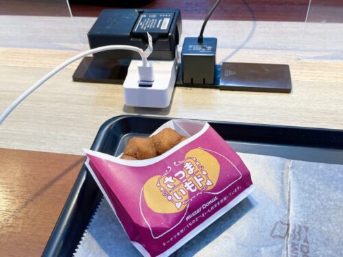 そして、食べました。屋上から降りてくる時に充電が切れたので、充電もかねて自分へのご褒美。わたしの友人が長年働いているのですが、今日はいませんでした。(ミスタードーナツ JR京都駅ビルショップについてはこちら)。こちらは充電ができるのでちょっとしたPC作業などする場合も使えそうでした。